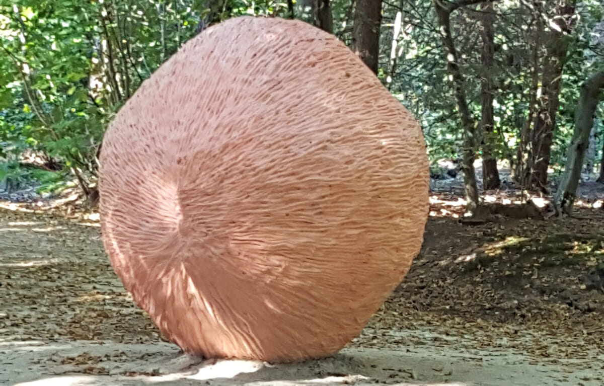 Van haar eigen site: “Aquaresin, steel, aluminum, glass fiber, pigment – 80 x 80 x 84 inches – Lustwarande 2015, de Oude Warande forest, Tilburg, Netherlands.” Ook de fraaie bol zelf staat er afgebeeld, met close-ups en een video over de wording van Blind Spot II. (Het is dezelfde als die hieronder.)